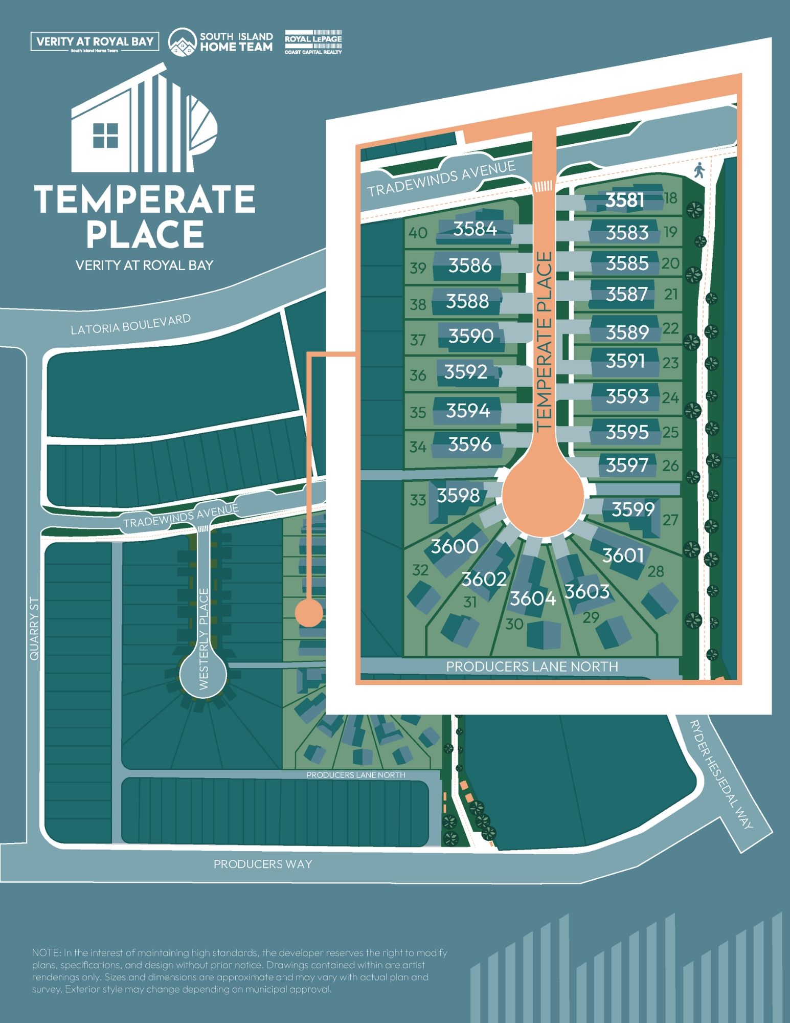 Tucked on a quiet cul-de-sac in Royal Bay, Temperate Place offers a modern West Coast take on comfort, design, and livability. Each of the 32 homes includes a legal suite, designer-selected finishes, and a fully landscaped yard — all crafted with the thoughtful quality Verity is known for.
